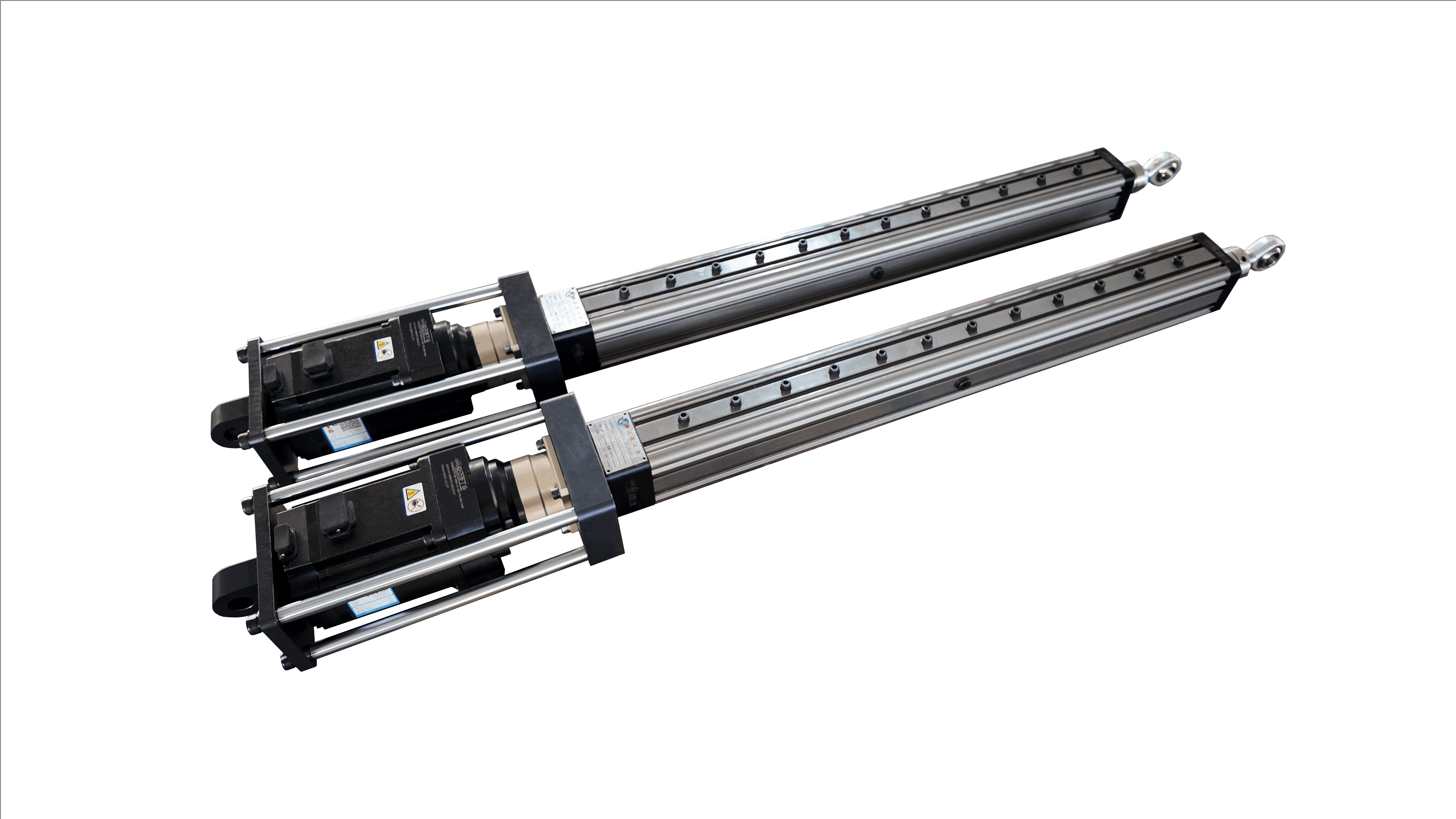 本项目为客户定制用于产品耐久性检测的DMC系列电缸组,通过三种参数规格覆盖不同测试环节。电缸采用高刚性单片尾铰与关节轴承安装,内置防转机构,并针对底部拉杆等结构进行受力优化,xian著提升电机与整机在长期循环运行下的可靠性。